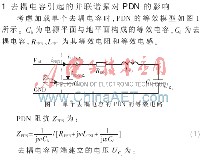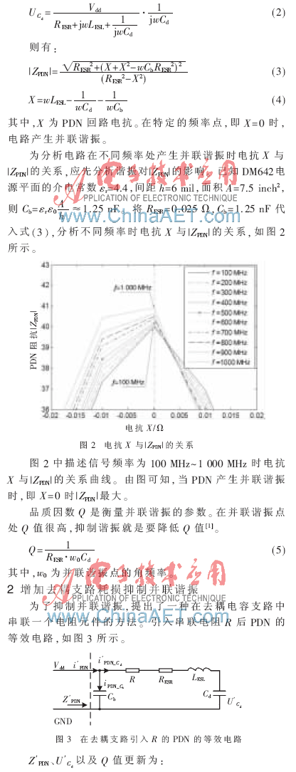 当PDN并联谐振时,谐振频率处会产生高阻抗。为了抑制这种高阻抗,参考文献[2]通过引入电磁带隙结构(EBG)来抑制谐振,但EBG结构会影响电路的信号完整性;参考文献[3]在电容支路引入电感元件,通过控制谐振点抑制谐振产生。该方法只是将并联谐振从一个频点转移到另一个频点。