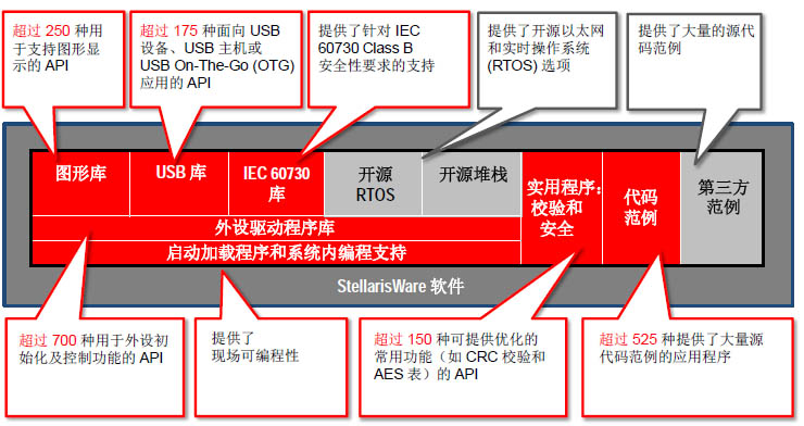 StellarisWare也是一个很大的卖点。业界通常的开发流程是:硬件定义、芯片开发、仿真、第一次投片制造、软件开发、投片后验证。而TI并不想把软件开发放在第一次投片之后,而是将软件和硬件的开发同时进行,软件开发贯穿于芯片开发、仿真、投片的整个芯片开发过程中。这样使用者只需要关注软件开发,而不用担心底层驱动,不用阅读几百页的应用手册以后才开始,只需知道API即可。StellarisWare包括的东西很多,如图3所示,应该能找到你需要的东西。