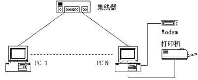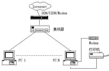 信息化最简单的应用,就是将若干个计算机连接起来组建成对等网络,计算机可以相互共享资源。如果其中一台计算机安装了打印机、Modem,其他计算机可以通过局域网共用这台计算机的打印机和Modem,进行文件打印、上网查询等。利用相应的软件,可以实现定单管理、信息查询、数据统计等功能。图1是这种应用的网络拓扑图。