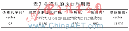在DSP实现中,通过指令并行,尽量优化程序循环体,减少或消除程序中的‘NOP’指令[5-6],以常规CP为例,各个模块的运算cycles数统计如表3,通过表中的值可以看出,PHICH信道的执行时间非常少。当运用TMS320C64×DSP芯片实现时,完全可以满足实时性信号处理。