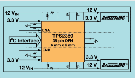 在迅速地扩大采用 ATCA 及 MicroTCA 之后,设计人员则面临智能型集成在严格的要求与时机方面的挑战。如图 3 所示,TPS2359 是一款双插槽 AdvancedMC 热插拔控制器,这类器件都是通过一个集成电路进行多个通道的控制和热插拔功能的。