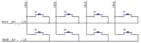 为了减少对单片机I/O口的占用,设计采用非编码式2×4矩阵键盘。键盘电路原理如图9所示,DIG0~3与SEGA、B接扩展芯片74LS373上。