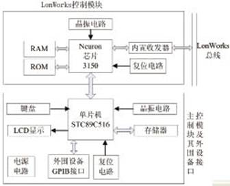 智能控制节点的总体结构如图2所示,主要分为LonWorks控制模块与主控制模块及其外围设备接口。