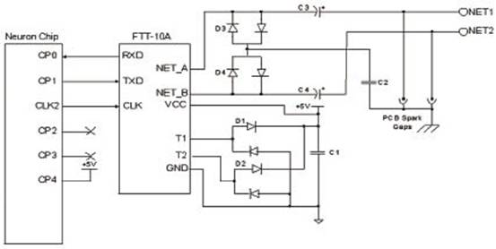 FTT-10A收发器由一个隔离变压器和一个集成的78kbps微分曼切斯特编码收发器组成,收发器管脚与Neuron芯片的通信端口(CP)和时钟线、+5V电源及双绞线网络线相连。FTT-10A收发器自动检测输入时钟频率是在5MHz、10MHz还是20MHz。当无电源供给时收发器输出呈高阻状态,当收发器电源下降时不会影响网络通信。