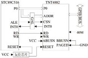 本节点设备端使用GPIB专用芯片TNT4882实现GPIB接口功能,TNT4882是美国NI公司的一款单芯片、高速、听/讲功能兼备的GPIB接口专用芯片。TNT4882芯片使用简单灵活,可方便地连接各种8位和16位处理器,除了40MHz的时钟外不需要其他任何外围芯片即能直接与GPIB总线相连。TNT4882有三种不同的硬件接口模式:单片模式、Turbor+7210模式以及Turbor+9914模式,本设计采用单片模式。GPIB实现的硬件连接如图12所示。