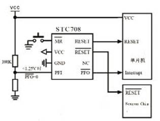 复位电路采用复位芯片STC708,它具有较宽范围的用户自定义门限电压,具有上电复位、掉电复位和外部手动复位等功能,能进行电源稳压块前端掉电检测,可实现高/低电平两路复位信号输出,图7为复位电路图。