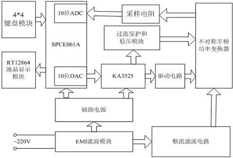 针对以上问题,本文采用基于KA3525 PWM控制芯片的不对称半桥式功率变换器,并采用16位凌阳单片机作为数控核心,通过其内置的D/A输出调制PWM,提高了电源的输出精度和效率,并且方便使用者操作,实现了基于单片机的数控开关电源。