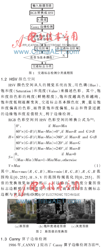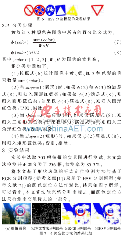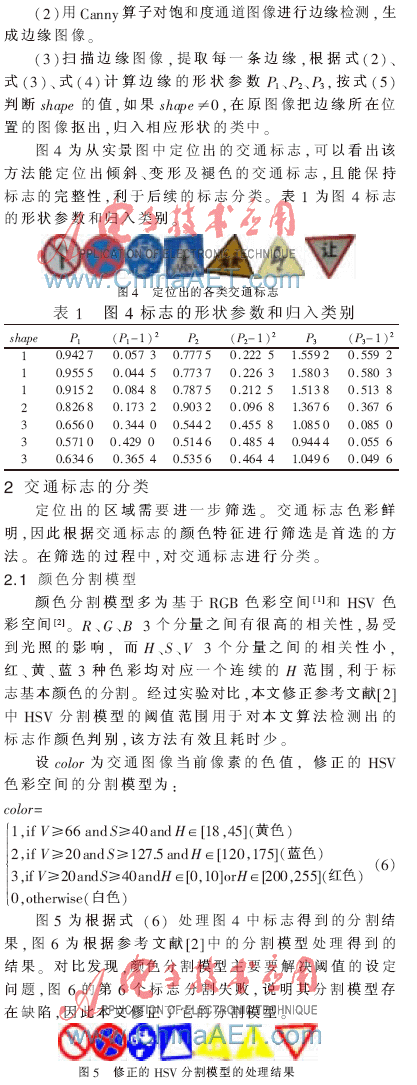 交通标志类别与其颜色及几何形状之间具有唯一的确定性关系。本文针对交通标志的形状和颜色两个特征,提出了一种基于形状边缘定位检测和颜色判别分类的交通标志检测分类方法。该方法在饱和度S通道检测标志边缘,通过边缘的形状参数判定标志的几何形状,定位出标志;采用修正的HSV色彩空间分割模型判别标志颜色以进行标志分类,分类过程中筛除了非标志区域。