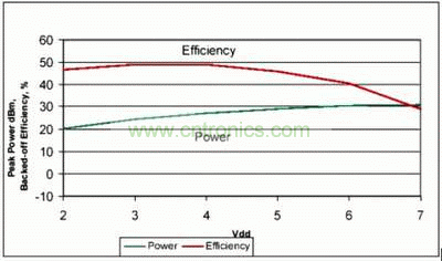 驱动级对总体功耗也有贡献。包括驱动级在内的功率添加效率(PAE)在7.8dB后退点处大于33%,此后退效率可以在广泛的电源中实现。图5显示了各种电源电压下放大器后退7.8dB时的效率,注意,确实有两种方式控制放大器的瞬时输出功率,即异相和改变电源电压。电源电压通常用于缓慢改变平均输出功率,相位角用于快速改变信号的瞬时包络线。