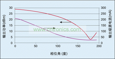 图3显示了输出功率和输出级源电流与放大器驱动信号相位角之间的关系,该图数据得自于一个运行在5.25GHz、Vdd为5V的放大器。请记住,放大器已进入深度饱和,因而工作在恒定的电压振幅下,但要注意源电流与异相角有很大的关系。这说明每个放大器的阻抗(往合并器方向看)在低输出功率时确实增大,而源电流在下降。