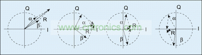 图1用矢量图显示了两个电压恒定、相位不同的信号α与β如何合并起来形成一个任意电压信号R,图2是采用异相技术的功率放大器结构示意。
