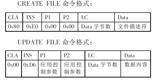具体应用时首先使用CREATE FILE创建文件,然后再使用UPDATE FILE添加数据。同时根据文件系统的需要,还要提供SELECT FILE、READ FILE、DELETE FILE等命令。