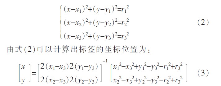 由式(1)中可以看出,射频参数A和n的值决定了接收信号强度和信号传输距离的关系。A和n用于描述通信操作环境。射频参数A被定义为dbm,表示距发射机1 m时接收到信号平均能量的绝对值,如平均接收能量是-10 dbm,那么参数A就被定义为10.射频参数n指出了信号能量随着到收发器距离增加而衰减的速率,其数值的大小取决于无线信号传播的环境。通过大量的比较和验证,得到实际应用场合环境因子EAF的大概值为13.5,A取45,n取3.5.依据式(1)可得到待定位标签到读写器的直线距离,r表示读写器与待定位标签之间的距离,即r=d.3个读写器的位置已知,分别是p1(x1,y1),p2(x2,y2),p3(x3,y3)。则待定位标签的坐标计算如式(2)所示: