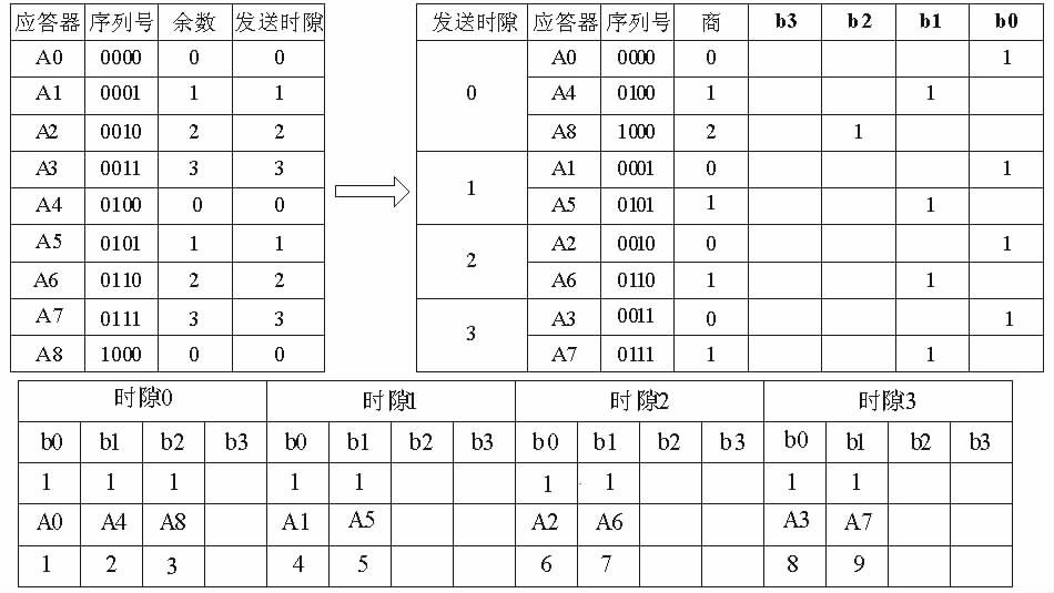 图3倒数第二行为9个标签的发送时序,发送的时序是A0,A4,A8,A1,A5,A2,A6,A3,A7.这样这9个标签就可以保证无碰撞地被读写器识别,这种多标签防碰撞冲突是多标签定位系统能够正常工作的前提。