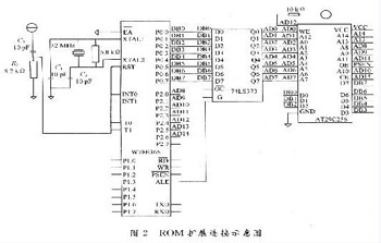 W78E365内部ROM仅64 KB,内存太小,故采用AT29C256作为外扩ROM.线路连接见图2.