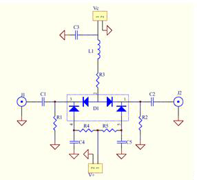 二极管的偏置电流和衰减由Vc控制,电阻R1和R2作为串接和分流二极管的偏置返回路径,由于这二个电阻会对射频路径进行分流,因此它们的电阻值必须高到足以屏蔽射频,但又不能大到会有过大直流电压出现其上。流过分流二极管的电流由固定电压V+提供,并受R4-R5电阻限制,在这个设计中,采用1.5V的经验值V+可以得到所有衰减值的最佳回返损耗。