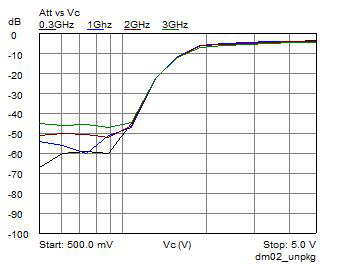 图8显示衰减相对于控制电压Vc的关系,对低于1V的Vc,衰减几乎不会变化,高于1V时,衰减会随着Vc快速改变,直到超过2V时变为平坦。虽然图中显示衰减在2V以上变为稳定,但实际上在2V到5V间还是会有大约2dB的变化,当Vc=5V时,衰减达到大约-4dB的最终值,这个数值在0.3GHz到3GHz时相对稳定,可以明显由图中交叠曲线看出,因此可用的Vc范围为1V到5V,大部分衰减集中发生在1V到2V范围,这是将控制电压由15V降低到5V无法避免的权衡结果。