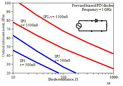 图3:500ns和1500ns二个不同载子寿命模拟的IP2和IP3相对PIN二极管电阻值,二级管采1GHz串接配置