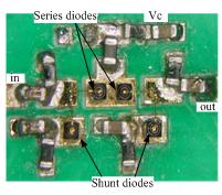 共有4个PIN二极管、6个电阻、5个电容器和1个铁氧体磁珠电感被集成到单一3.8mm x 3.8mm大小的VVA模块中,器件以板上多芯片MCOB形式组合到10mil厚的Roger RO4350电路板(Er =3.48, tanδ = 0.004 [注 1])上,通孔连接顶端电路走线和底端的直流和射频器件接点,接着器件面被模塑形成1mm的封装高度。