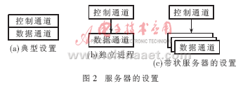 (1)实现。Globus项目在GridFTP协议基础上实现了GridFTP服务器端、GridFTP客户端、API函数库以及一系列的相关工具。最新的GT4中GridFTP服务器已不再基于wuftpd,而是重写了代码,实现了控制通道和数据通道完全分离。一个控制通道后面可以有多个数据通道(这就是带状传输服务器的实现方式)。服务器几种可能的设置如图2所示。
