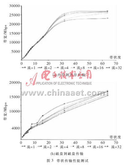 (2)性能。根据实验,在千兆网络环境下的单服务器对单客户端传输性能:当TCP流增多时传输带宽有明显的增大(达到200Mbps)。总的来看,GridFTP的性能可达到Iperf(一种网络带宽和性能测试工具)的78%;在万兆网络(30G)环境下的带状服务器对单客户端传输性能:当进行内存到内存传输时,随着带状数的增加,传输带宽几乎呈线性增长(斜率接近1),32个数据节点时可以达到27Gbps的带宽,近90%的利用率;当进行磁盘到磁盘传输时,由于受到存储系统的限制,但仍然达到了17.5Gbps的带宽。带状传输性能测试如图3所示。