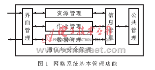 网格可以简单地划分为分布式资源、网格系统和网格应用3个层次。网格应用层处于网格的顶层,分布式资源为网格的物理层即为网格底层,网格系统处在分布式资源和应用层之间,在应用层和资源之间起到桥梁作用。完整的网格系统需要有如图1所示的基本管理功能。
