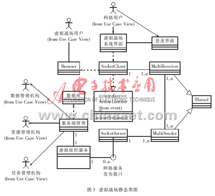 该虚拟战场的UML类图如图3所示,其中网格客户端体系结构使用C/S模式构造,在实现中分5个模块组成:服务端监控中心模块、多线程发送器模块、本地处理机模块、多线程接收器模块和后台数据库维护模块。由于本地处理机模块必须监听各种事件,并做出相应的事件处理,所以需要实现事件监听接口。