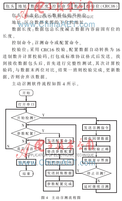 如图3所示,主动召测功能可测得当前系统的水流量报警门限值、一定时间内的累计水流量值,以及产品规格和警报强度,同时可通过该软件对系统参数进行配置,如报警次数和警报强度等。
