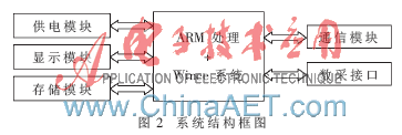 如图2所示,本系统主要结构可分为供电模块、显示模块、存储模块、通信模块以及各类数据采集接口等。其中通信部分主要以华为公司的mc323通信模块作为主芯片,结合TCP/IP技术实现无线数据的点对点传输,移动中心站既可作为服务器向监测站发送指令,也可以作为客户端向中心站发送采集到的数据,同时可对指定手机用户以短信的方式发送实时采集到的数据。主要的数据采集接口包括USB接口、RS232接口、RS485接口以及以太网口等[3-4]。电源模块外部供电采用12 V锂电池,根据系统需要进行电压转换,在系统外围留有充电器接口,可采用专用适配器进行充电,固定放置时也可外接太阳能电池板进行充电。其他模块可根据系统功能进行定制。