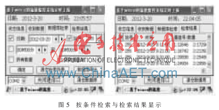 数据库的一个重要功能就在于可以按条件检索库中的数据,当然大多数人并不习惯使用数据库管理工具来检索,所以本系统中直接加入了按条件检索数据的功能,可以方便直观地帮助管理员来查看某个时间段或某个站号的上报数据。图5所示为条件检索及检索结果的系统截图。