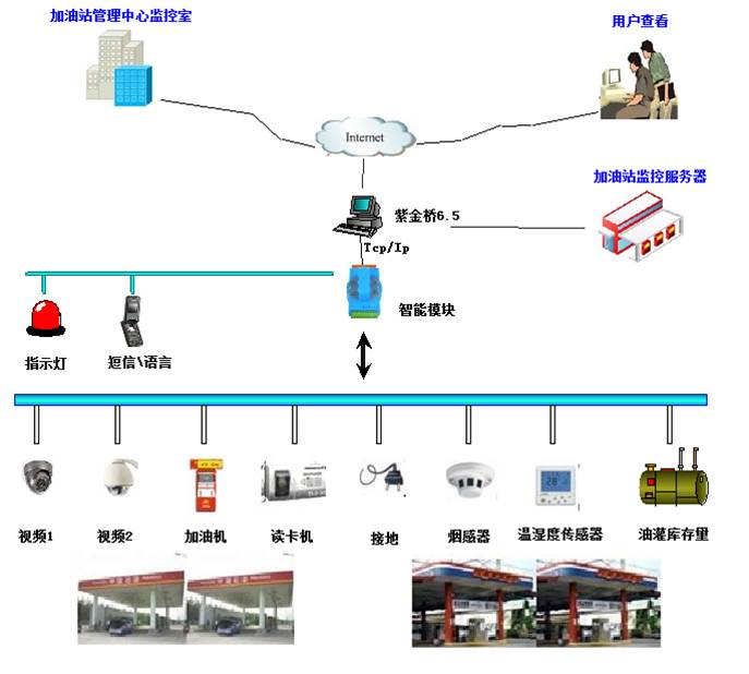 本监控系统以基本测量仪表作为信息采集单元,经过智能化处理,通过现场总线分散采集、集中显示系统可实现对各加油站内各油库油量、温湿度、油机、流量计、设备接地等经营、安全数据进行实时监测和集中统一管理。紫金桥监控组态软件(RealInfo6.5)负责对采集的信息进行分析,可通过油量的变化分析储罐是否发生泄露,实时显示并可打印加油站的相关数据、图表等。通过对历史数据的分析,发现经营管理中的问题,提高管理能力,降低运营成本。