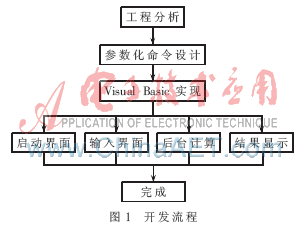 Visual Basic是基于Windows平台的开发工具,它以结构化Basic语言为基础,继承了原Basic语言简单易学的优点,同时提供了可视化的编程环境,以事件驱动作为运行机制,利用系统提供的大量可视化控件,可以非常快速地开发出适合用户要求且十分友好的图形化操作界面(GUI)[3]。针对上面提到的有限元软件的通用性和专业性问题,将通用分析软件所涉及到的前处理、计算过程和后处理等过程命令进行打包封装,命令中关键参数利用Visual Basic建立界面方便用户进行输入,在后台调用通用软件进行计算,可以大大简化分析过程,弥补通用分析软件的不足。将以上解决方案用于管道工程应用领域,可以开发出用于管道应力分析的参数化计算机辅助分析平台[4],其基本的开发流程如图1所示。