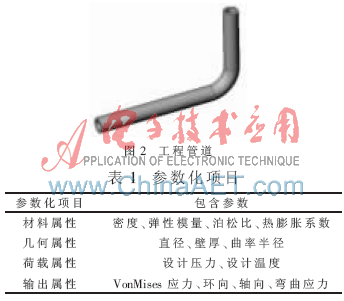 后台分析软件采用ANSYS,该软件具有管道单元可以模拟管道的各种属性,同时可以加载结构和温度载荷,非常适合进行管道的应力分析。此外,其APDL语言是一种十分高效的命令行操作方式,所有的命令均可以保存成文本的格式进行操作[5]。以石油化工工程领域中,同一平面内的两段直管和一段弯管构成的管道为研究对象,如图2所示。首先参数化命令的设计均用APDL建立关键的输入参数,一般包括材料属性、几何属性、荷载属性、输出属性等,详细的参数定义见表1。同时将这些参数均嵌入到APDL语言按照有限元分析的一般步骤中去,完成建模、加载分析、结果输出等功能,保存成文本文件File_APDL.txt,用于后面设计的Visual Basic程序进行该文件调用和操作。