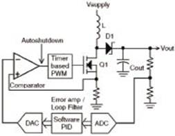随着电感内电流的形成,占空比计数器将继续向上计数。如果电感电流先达到期望值,比较器将终止脉冲,电感开始向输出电容放电。如果PWM计数器先达到特定的占空比值,比较器将终止PWM脉冲。该方法在模拟和数字两个领域都达到了最佳效果——既可以得到一个不需要高MIPS处理器的快速电流模式反馈,又可以具有设定最大占空比来限流的能力。