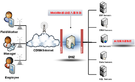 Mobillin 由服务器端和客户端两部分组成,通过无线互联网络进行连接。服务器架设于用户单位局域网中,负责连接用户业务数据库和应用系统。客户端安装于手机/PDA 等无线终端,通过无线互联网络连接到 Mobillin 服务器,读取数据和指令。