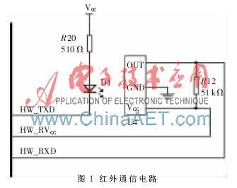 目前,热量表的通信方式主要有三种形式:(1)M_BUS通信,用于远程读取热量表数据的总线标准;(2)红外通信,采用红外发送接收管,进行近距离的通信,主要应用于手持红外设备对热量表进行近距离抄表;(3)RS-485通信,利用一对双绞线,实现平衡发送和差分接收,硬件简单,成本低廉,多站互联较为方便,工业应用成熟[3]。比较三种通信方式,公司研发的热量表采用了前两种通信方式,即M_BUS通信和红外通信。而热量表系数修正软件正是以红外通信为基础来实现的。下面简单介绍所设计的超声波热量表的红外通信电路。