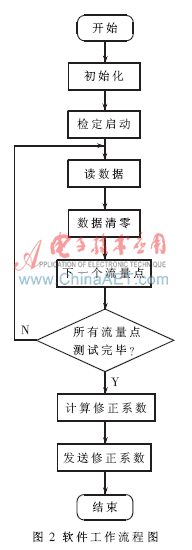 VC++由于功能强大和应用灵活,同时具有图形界面友好、系统资源丰富、操作配置方便、运行速度较快等特点;而串口通信具有实现简单、使用灵活方便、数据传输可靠等优点,因而用VC++编制串口实时控制软件十分方便[4]。在检定超声波热量表时,为了缩短检定时间,提高检定效率,该软件一次需要与多块热量表进行串口数据通信,从而需要开辟多个串口,完成多串口的读写命令又会涉及到多线程串口的操作。因为此时程序需要循环检测串口的事件状态,当串口出现收发事件时,必须立即进行串口的读写操作。若将这些循环检测操作放在主线程中,将使主线程执行速度变慢,程序的效率降低[5]。该系数修正软件利用多线程串口通信库CnComm来解决多线程串口通信问题,从而提高了计算机执行程序的能力以及软件运行和执行的效率,并通过ADO类对数据库进行访问,实现热量表检定数据的记录保存。软件工作流程图如图2所示。