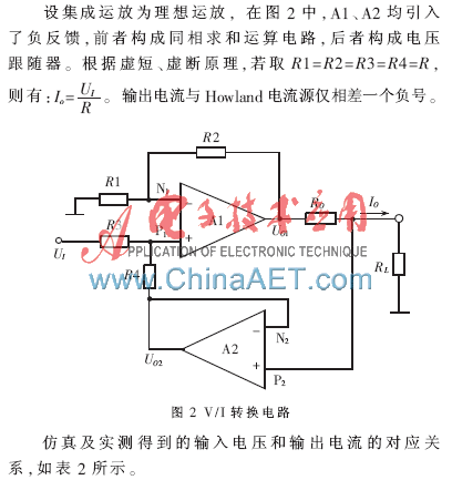 Howland电流源电路虽然结构简单,但是输入和输出反相,不能满足设计需要。为解决这个问题,将其延拓即得图2所示的V/I转换电路。