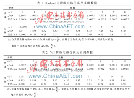 表1和表2均表明仿真效果很好,但实际电路的效果并不理想,输出电流的精度较差。这是因为仿真过程中数据是理论值,运放参数被理想化,而实际的运放都不理想,Avd、Rid、KCMR并非无穷大,Rod也不为零,故Io和Ui的关系不能严格满足理论公式。所以仅有单纯的Howland电流源电路或V/I转换电路并不能构成精密压控电流源。