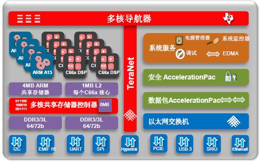 与市面上其他多核ARM处理器不同,KeyStone II SoC具有全面的多核优势:其将互联带宽提高了1倍;数据通道从126 bit提高到256 bit;接口时钟速率也提高了1倍,这样可以让多核中每个处理器的性能都能得到释放,实现1+1大于或等于2。其增强型存储器控制器能够更好地管理内存以及外部存储器接口,实现对外部存储器进行高速低延时访问。此外,由于集成了1~10 G以太网交换机模块,从网络上过来的多路网络信号能直接在SoC中进行相应的交换处理,而不需要外置的网络转换。所有这些都可以让云应用获得新生,而不再仅限于传统的服务器、存储与连接。