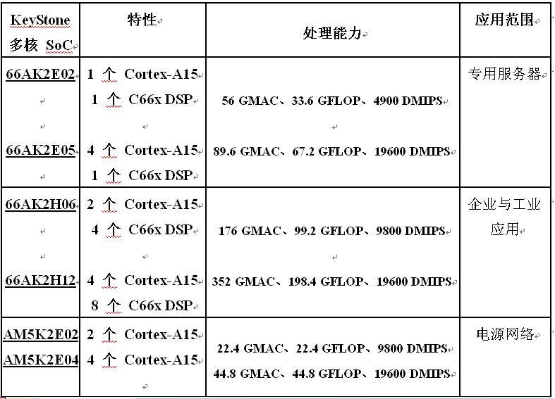 TI最新推出的6 款28 nm多核SoC包括66AK2E02、66AK2E05、66AK2H06、66AK2H12、AM5K2E02 以及AM5K2E04,它们都建立在KeyStone II多核架构基础之上,并整合了ARM Cortex-A15 处理器、C66x DSP、数据包处理、安全处理以及以太网交换,可将实时云转变为优化的高性能低功耗处理平台。其实今年3月TI推出的TC16612/4/6 SoC就集成了ARM Cortex-A15和C66x DSP,它们主要针对小型蜂窝基站的应用。 然而,如此卓越的架构应该服务于更多领域,此次,TI 就把它延伸到了云端,为云应用注入了新的活力。6 款最新SoC有2~12个核,总计15 GHz,速度范围为800 MHz~1.4 GHz,而功耗却只有6 W~13 W。光看这几个指标就知道,这6款SoC能突破目前云应用中的诸多瓶颈。