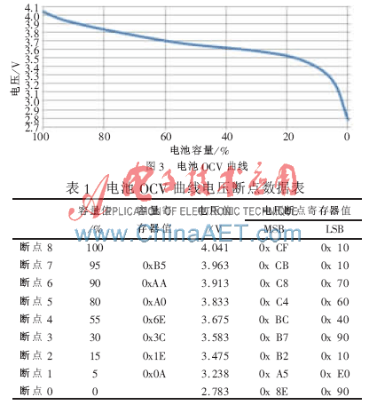 本文的手持式分析诊断仪使用容量为4.8 Ah的锂电池,电池的OCV曲线如图3所示,依据9点分段线性近似选取的电池OCV曲线的电压断点数据及对应寄存器值如表1所示。