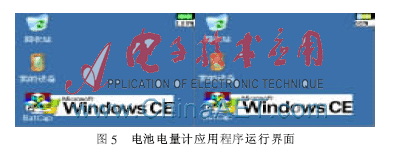 本文使用EVC++集成开发工具,根据MFC的消息映射机制[4]为手持式分析诊断仪开发了一个电池电量实时显示程序BatCap.exe。BatCap.exe通过调用fuelgauge.dll实时获取电池电量数据,并在系统界面更新和显示。程序运行界面如图5所示。