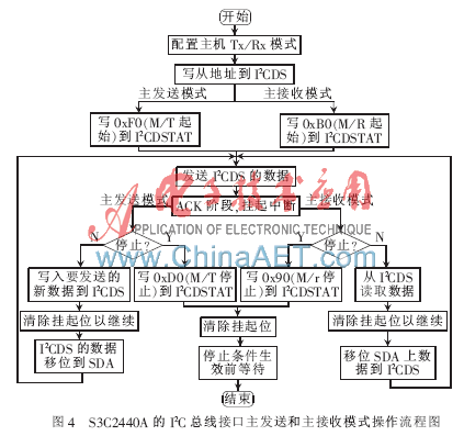 (2) FGA_Read()函数完成对DS2786B芯片采集到的电池电量数据读取。其中的I2C_WRITE()和IIC_READ()是根据DS2786B的I2C总线接口基本传输格式和S3C2440A的I2C总线接口主发送和主接收模式的操作流程(如图4所示)编写的I2C读写函数。代码如下: