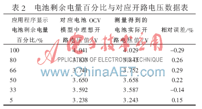 利用BatCap.exe程序可以对电池电量计模块驱动程序进行测试。测试步骤如下:(1)根据BatCap.exe程序界面电池电量的显示和图2的电池OCV曲线图,得出相应电池剩余电量百分比所对应电池OCV模型中理想开路电压值;(2)用万用表测得此时电池的实际开路电压值,并将两电压值进行比较。实验采用基本精度为±0.1%的UT56数字万用表,选取电池剩余电量百分比为100%(满电量)、80%、66%(2/3电量)、50%、33%(1/3电量)和5%(低电量报警电量)6个状态进行测量,测试数据如表2所示。测试数据表明,电池电量模块驱动程序测量电池剩余电量相对误差范围为±0.30%,能精确地测量电池剩余电量。
