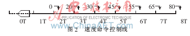 列车速度调整主要包括3个因素:与先行列车的间隔距离;列车运行的进路情况,包括前方进路是否存在弯道及道岔状态等;当前列车运行的准点情况[2]。图2是一条速度命令控制线[3]。当先行列车在0T区段,1T必须空闲,后续列车如果在2T,它收到的限速命令应该为0,即后续列车在2T的出口端必须停车,并有1T闭塞分区作为保护距离;若1T、2T空闲,后续列车在3T,则后续列车收到的是20 km/h的速度命令。同理,当1T、2T、3T、4T、5T、6T、7T都空闲,运行于8T的后续列车收到的速度命令为80 km/h。可见要使列车运行于80 km/h,前方必须有7个闭塞分区。