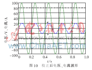 本文仿真了输入电压范围是交流154 V~264 V,输出为28 V直流,标称功率为3 000 W,开关频率为50 kHz的Boost型变换器,模型中所用到的参数是根据UC3854的使用手册设计的。其仿真结果如图4~图10所示。图4为电路输入脉冲波形;图5为二极管电流波形;图6为主功率管电流波形;图7为电容电压波形;图8为电源电压、电流波形;图9为校正前电压、电流波形;图10显示了加功率因数校正后的电压与电流的仿真波形。通过波形的分析可以清楚地看到,用UC3854为主芯片的PFC电路,功率因数校正效果明显,输出的电压电流波形有很好的改善。