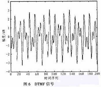 为了验证DTMF信号的可靠性,应用MATLAB进行仿真实验。需要设置一组DTMF信号频率组,本实验选择按键“0”的DTMF信号,其对应的频率组为1 366 Hz和941 Hz,导入到MATLAB后可以得到该信号的时域波形图(如图6所示),再选择其它频率组进行仿真实验也得到类似的结果。由此实验可说明一组高低频率可以有效地组合成一个DTMF信号,并且能被准确的识别和处理,由于DTMF拨号速率的高效性,避免了传统的拨号方式带来的缺陷,确保信号准确无误地传送,可以肯定本系统的可行性。