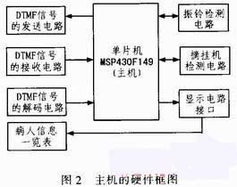 主机的设计采用MSP430F149单片机作为核心控制模块,它不仅控制着主机和分机号码的收发,还控制主机和分机的接通、振铃信号的通断、显示等功能。系统处在正常工作状态下,当主机呼叫分机时,通过相应的信号检测,主机电话机摘机后,拨打分机号码,经过DTMF信号解码后发送到相应的分机,分机电话机摘机后,主机和分机便可以实现通话,通话结束后挂机。当医护人员需要广播时,启动群呼功能,主机对所有分机广播,挂机后结束。当有分机呼叫主机时,主机接收到信号后对其进行编码,通过解码电路送入单片机,CPU读取信息后,显示电路显示相应分机的号码和呼叫时间,主机电话机摘机后,振铃信号清除,分机和主机便可以实现通话。