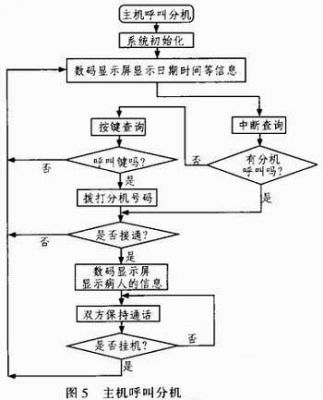 根据需要,设计出主机的呼叫工作流程图(如图5所示)。主机处在空闲状态下,即没有呼叫和通话时,走廊上的数码显示屏会显示实时的口期和时间等信息,同时主机会不断进行中断查询,判断此时是否有分机发送的呼叫信号,若没有的话就执行按键查询,判断是否拨号呼叫;当主机与分机进行通话时,双方接通后,此时数码显示屏会显示病人的相关信息,如病房号、床位号等。